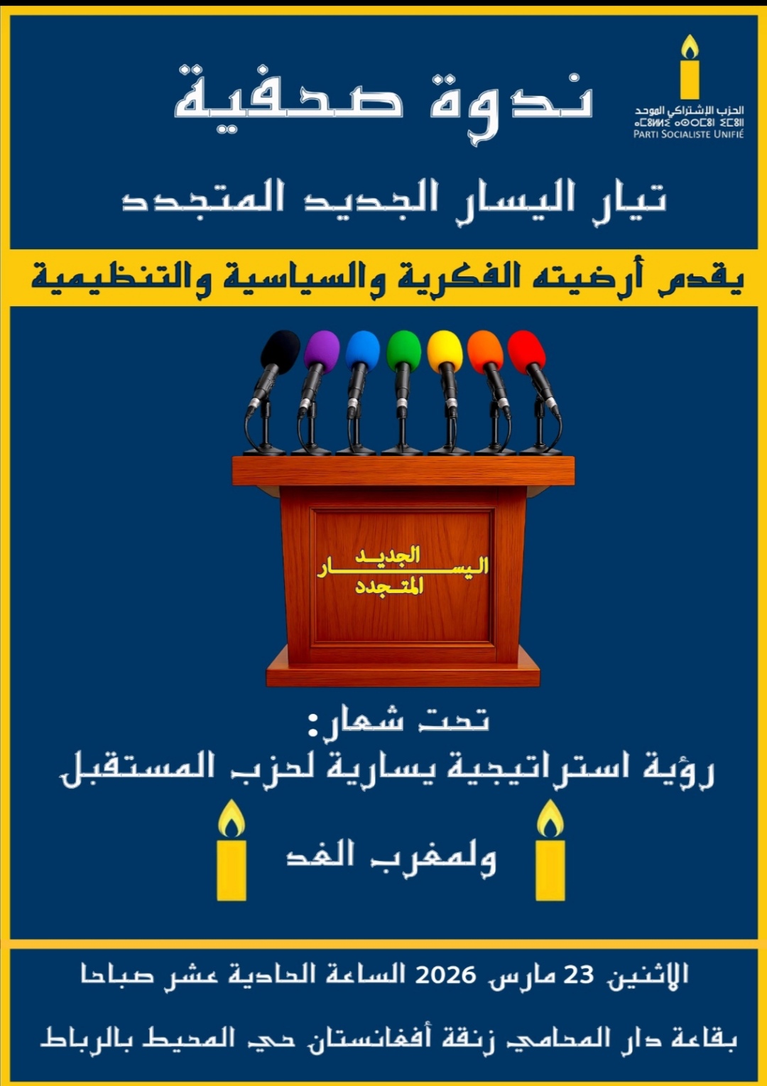 "رؤية استراتيجية يسارية لحزب المستقبل ولمغرب الغد"، وذلك يوم الاثنين 23 مارس 2026 الساعة الحادية عشر صباحا بقاعة دار المحامي زنقة أفغانستان حي المحيط بالرباط......التفاصيل